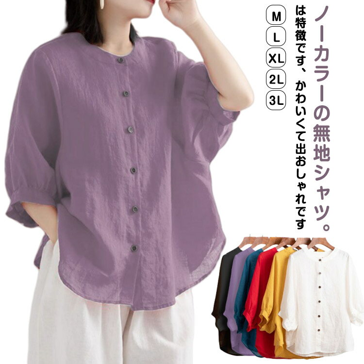 女性 綿麻シャツ 七分袖 バルーンスリーブ ゆったり 無地 リネン ブラウス 女性 カジュアルシャツ トップス ノーカラー Tシャツ ボタン留め 夏