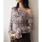tシャツ チェック柄ワンショルダーカットソー レディース