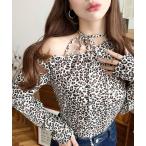 tシャツ レオパードプリントストラップチョーカーネックワンショルダー長袖プルオーバー レディース