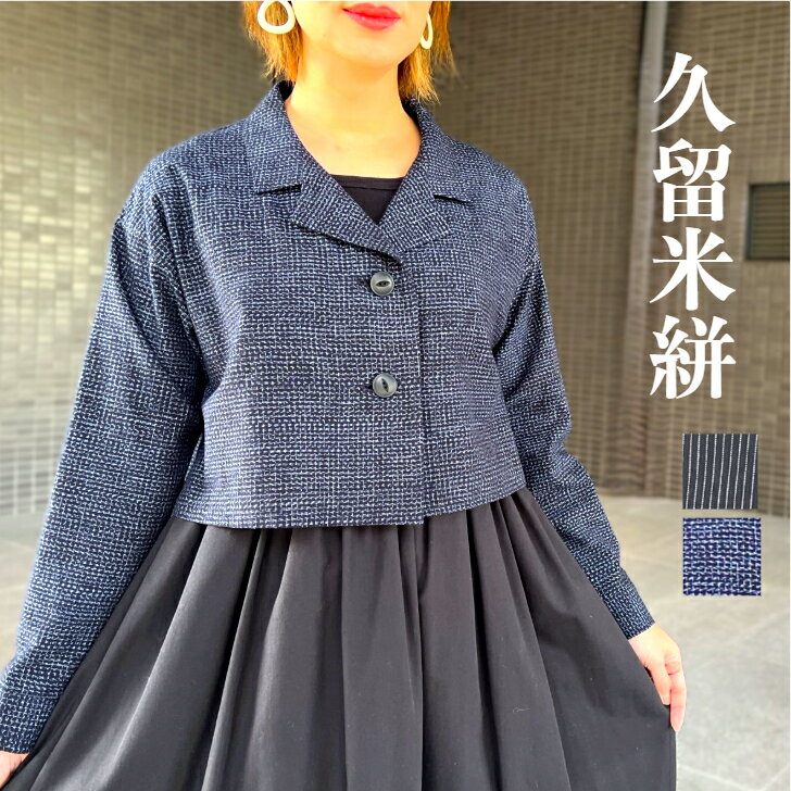 【久留米絣前開きショートブラウス】ミセス50代60代レディース綿100%羽織物日本製ネイビー濃紺黒ブラック文人柄書生柄縞柄ストライプ