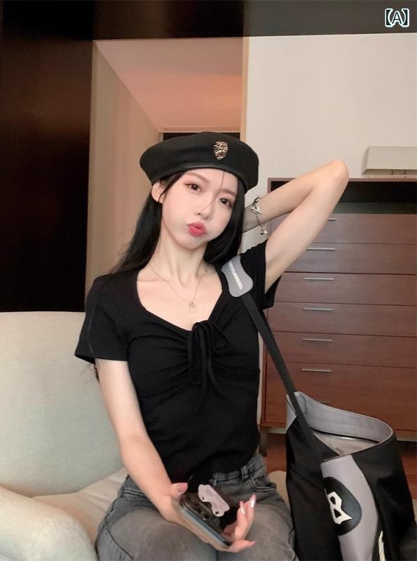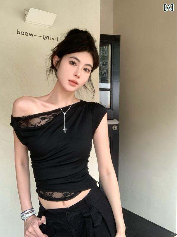 フリル シャーリング トップス レディース 春夏 かわいい レース ステッチ ホワイト オフショルダー 半袖 Tシャツ レディース 夏 スリム プリーツ 不規則 ホット ガール スリム ショート トップ