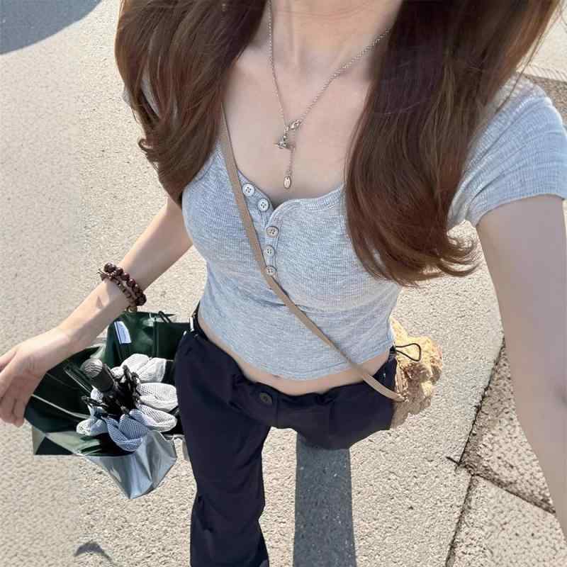 Tシャツ レディース Vネック 半袖 スリムフィット 着痩せ クロップド丈 トップス グレー ブラック ポリエステル カジュアル 肌見せ