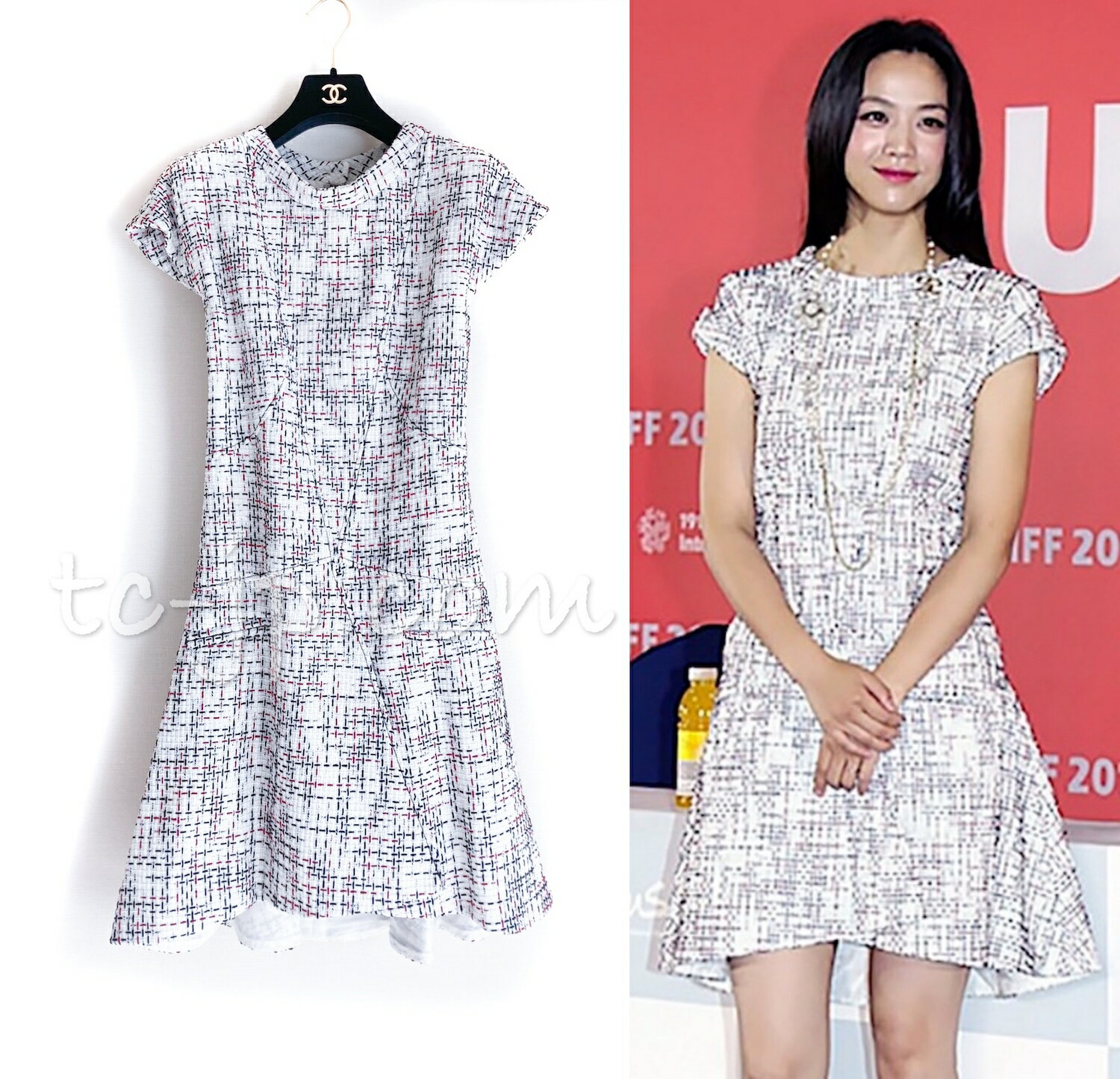 シャネル ワンピース CHANEL 66万 ホワイト アイボリー マルチ ツイード フレア カール・ラガーフェルド作品 超美品 38