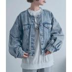 デニムジャケット gジャン ボリューム袖 ショート丈 カットオフ ノーカラーデニムジャケット Gジャン レディース