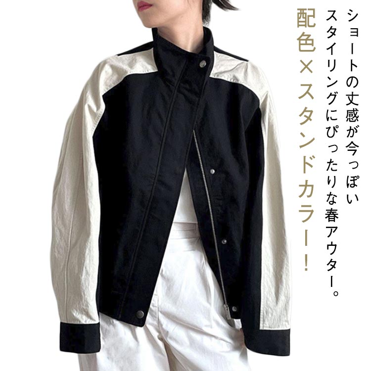 配色 ジャケット レディース ショート スタンドカラー 春アウター ライトアウター 薄手 フライトジャケット きれいめ カジュアル おしゃれ 韓国ファッション S M L XL
