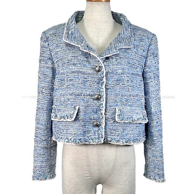 2015 CHANEL シャネル ツイード スタンドカラー ココボタン スカイブルー/ホワイト ポリエステル/レーヨン/コットン 44 P50997 テーラードジャケット 新品同様【中古】
