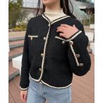 ツイード ニットカーディガン レディース カーディガン ニット ツイードジャケット きれいめ 春 秋 アウター ジャケット ショート丈 金ボタン ゴールドボタン ボレロ 羽織り 長め ミドル丈 黒 ノーカラージャケット カジュアル ゆったり 体型カバー ニットカーデ