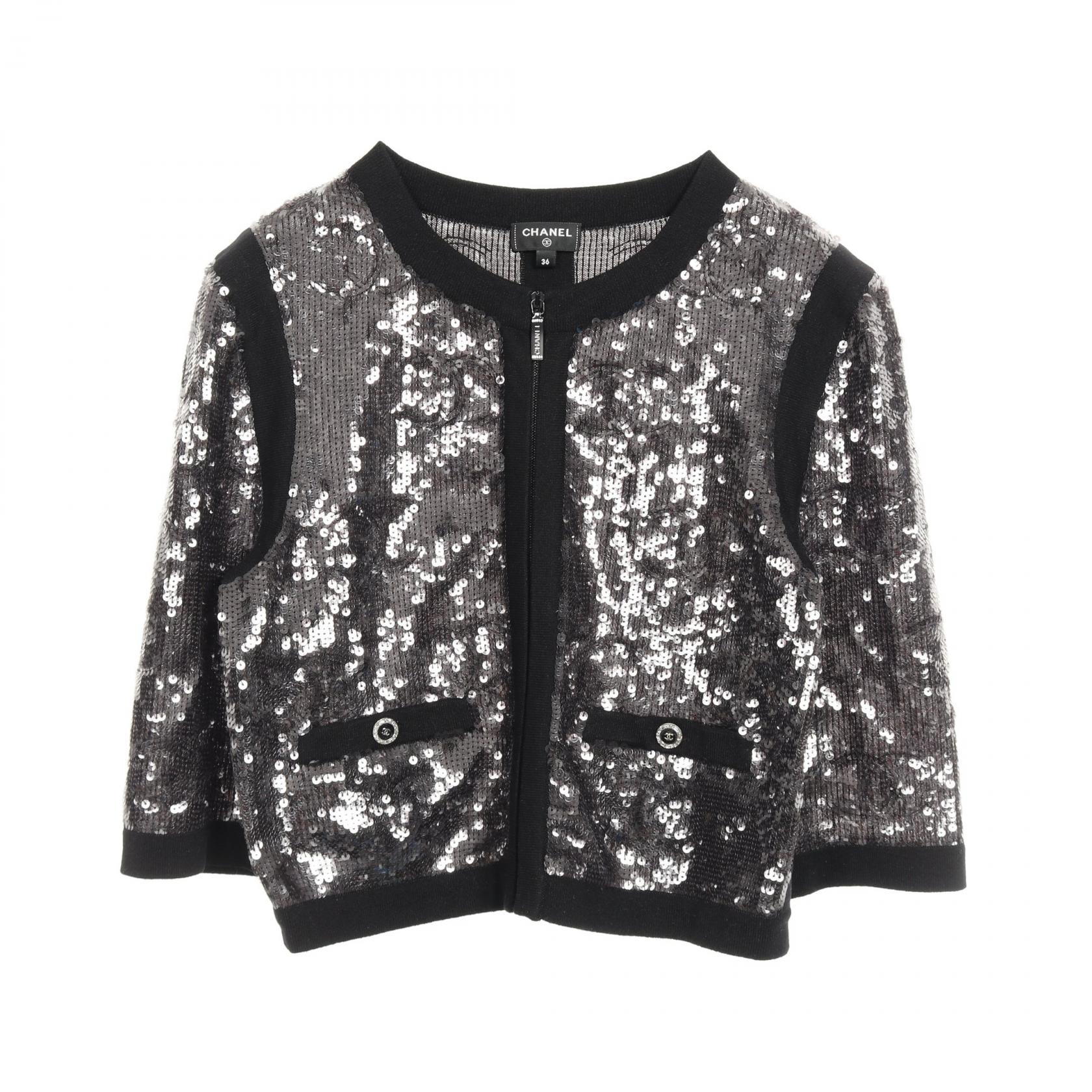 ◆まとめ買い|20%OFF対象◆シャネル CHANEL ココマーク スパンコール ノーカラージャケット 衣料品 アウター ナイロン コットン レディース ブラック系 P72744 【中古】