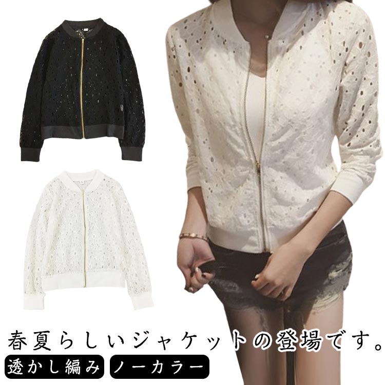 テーラードジャケット ライトジャケット ノーカラー 透かし彫り レディース ジャケット ブルゾン 長袖 薄手 春夏 秋 トップス スカジャン 羽織 アウター ジップアップ メッシュ 透け感 通気性 韓国ファッション 送料無料