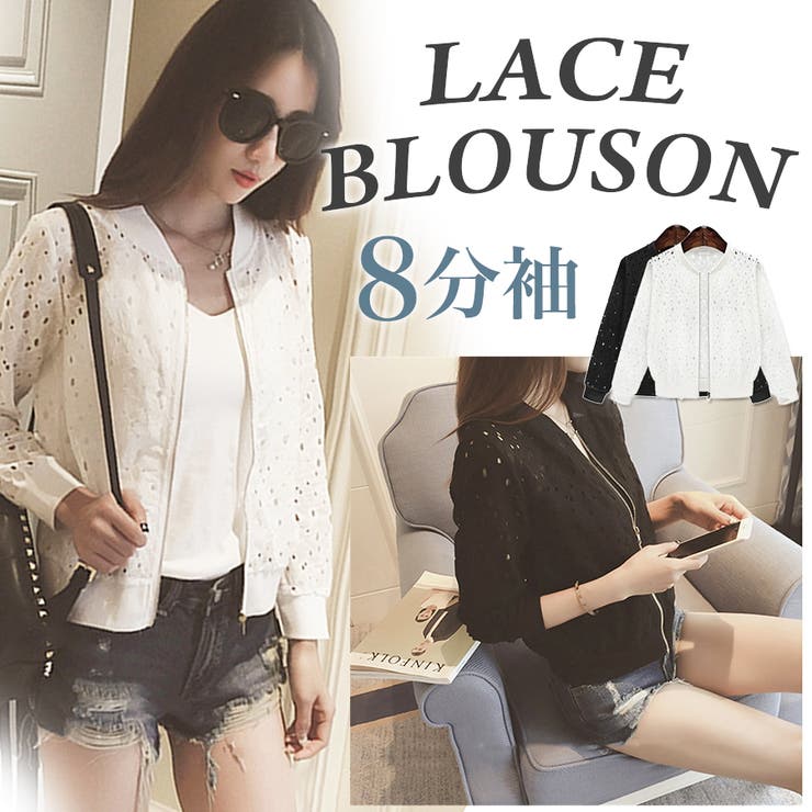 インナーショップDiamondHearts 【小さめサイズ】八分袖 ブルゾン 春夏秋物 ジャケット 総レース ジップアップ 花柄 アウター レディース 長袖 MA1 ジャンパー 春夏秋物 韓国ファッション 韓国 大きいサイズ 春 夏 トップス