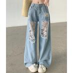 ジーンズ デニム デニムパンツ レースワイド ダメージデニムパンツ レディース