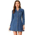 uxcell Allegra K Aラインカジュアルジーンズワンピース デニムボタンダウンカラーロールアップ 長袖 レディース ブルー 2XL