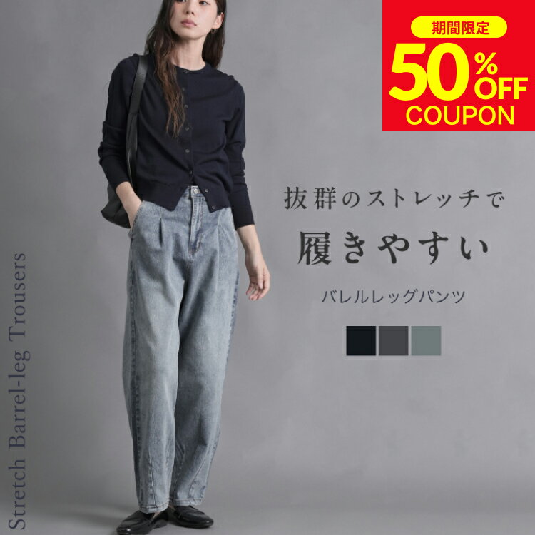\50%OFFクーポン有!ストレッチデニム 裏ゴムアジャスター タックバレルレッグデニムパンツ | カーブパンツ カーブデニム ストレッチ デニム ボタンホール レディース ボトムス カジュアル ジーンズ 美脚 ジーパン 体型カバー トレンド 落ち感 ラフ