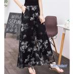 2022新作ガウチョパンツレディースプリーツシフォンウエストゴムゆったりウエストゴム着痩せ