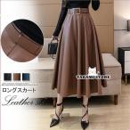 レザースカート レディース ロング丈 ベルト付き ハイウエスト フェイクレザー フレア Aライン 切り替え 秋 冬 着痩せ 通勤 エレガント 高級感