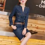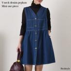 ワンピース レディース 春 夏 秋 冬 デニム 薄手 ミニ ミディアム Vネック ペプラム フレア ゆったり ジャンスカ 前開き ポケット