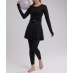 レギンス スパッツ 長袖クロップド丈ハーフジップリボントップス+スカート一体型フルレギンス 上下2点セット「ヨガ/フィットネス/ピラティス/ダンス/ジ