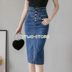 レディース スカート デニム ミドル丈 膝下 ハーフレングス ボトムス オールシーズン スリット ボタン ハイウエスト スリム 大人カジュアル 無地 定番 S-2XL