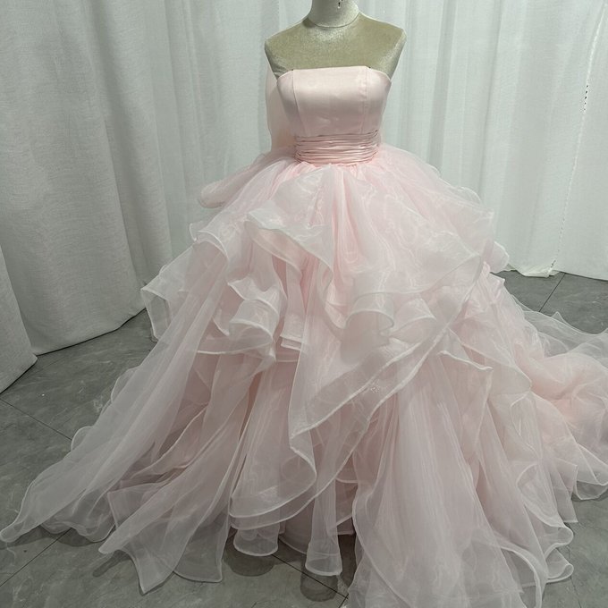 カラードレス ピンク ベアトップ ラッフルフリル ふっくら柔らかなバックリボン プリンセスライン フレアスカート