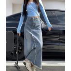 デニムスカート 「大きいサイズあり/ロング丈」 旬のY2Kスタイルに。切りっぱなしフリンジストレッチデニムマーメイドスカート レディース
