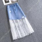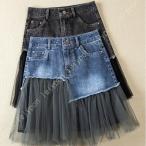 チュール付 デニムタイトスカート 裾チュール 切り替え デニムスカート マーメイドライン スカート タイトスカート ヒザ丈 レディース スカート タイト 美脚