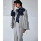 セットアップ 「低身長/高身長サイズ有」ドビー素材セットアップパンツスーツ3点セット(ノーカラージャケット+フレア袖ブラウス+リボン付ワイドパンツ)(