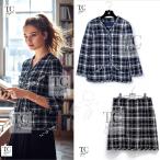 シャネル ジャケット スーツ CHANEL ネイビー ブルー アイボリー チェック コットン ノーカラー ツイード スカート 超美品 42