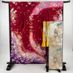 美品 振袖 身丈159cm 裄丈65.5cm M 袷 袋帯フルセット 草花 箔 金彩 赤 正絹 名品 中古