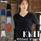 トップス ニット セーター 長袖 リブ素材 Vネック レーヨン混 ナイロン混 ベーシックカラー きれいめカラー レディース Honeys ハニーズ リブVネックニット