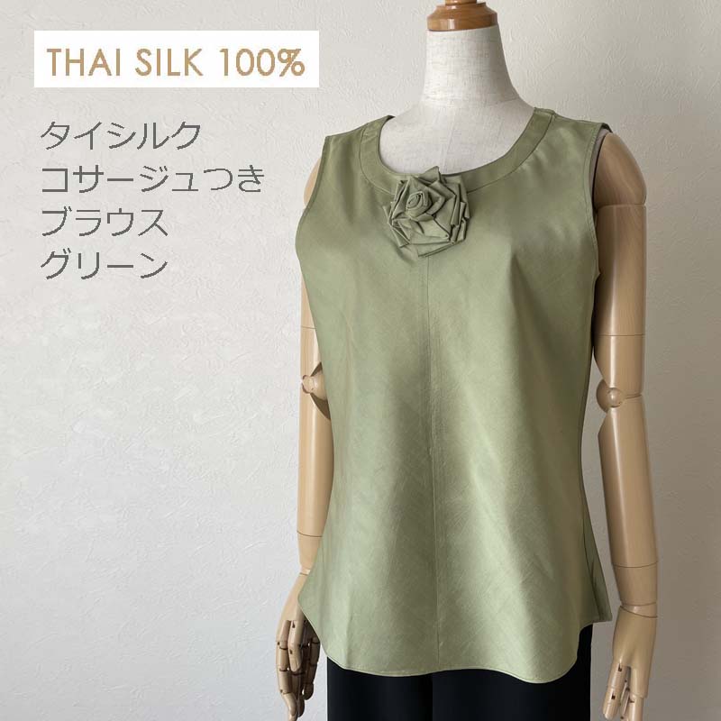 ブラウス コサージュつき タイシルク シルク100% ノースリーブ グリーン系 無地 フォーマル きゃらファッションオリジナル 送料無料