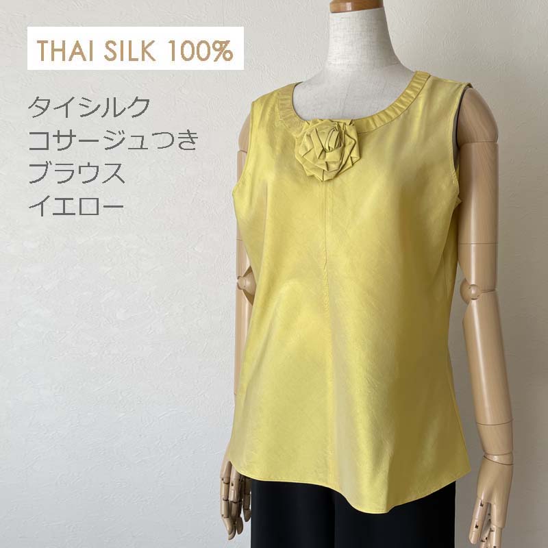 ブラウス コサージュつき タイシルク シルク100% ノースリーブ イエロー系 無地 フォーマル きゃらファッションオリジナル 送料無料