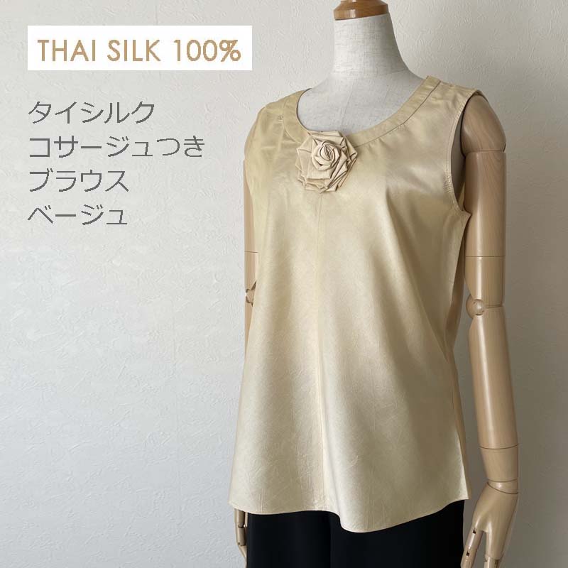 ブラウス コサージュつき タイシルク シルク100% ノースリーブ ベージュ系 無地 フォーマル きゃらファッションオリジナル 送料無料