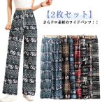 接触冷感 ワイドパンツ 2枚セット 総柄 レディース タイパンツ ゾウ 柄 冷感 涼感 アイス シルク パンツ ワイド ロング 夏 ルームウェア 部屋