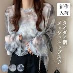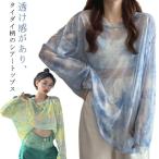タイダイ柄 シアートップス レディース 長袖 透け感 チュール Tシャツ カットソー 春夏 薄手 ロンT シースルー トップス ゆったり ドロップショルダー クールネック UVカット 日焼け対策 おしゃれ 韓国ファッション
