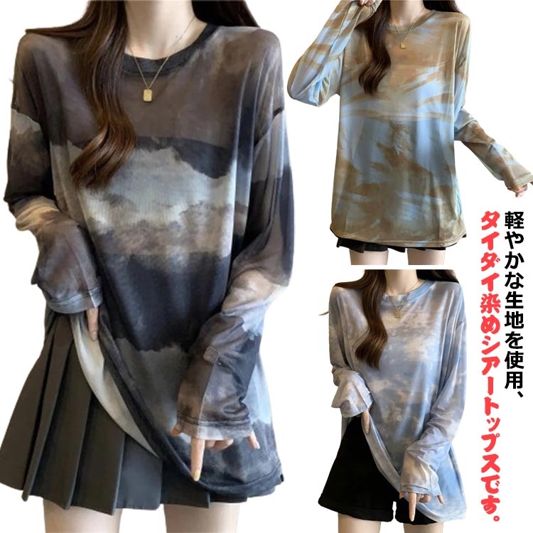シアーシャツ 長袖 レディース シアー Tシャツ シアーインナー タイダイ柄 シアーブラウス カットソー 春夏 ロンT 薄手 薄い チュニック 透け感 大きいサイズ ビッグシルエット ラウンドネック シフォン生地 やわらかい トレンド シースルー