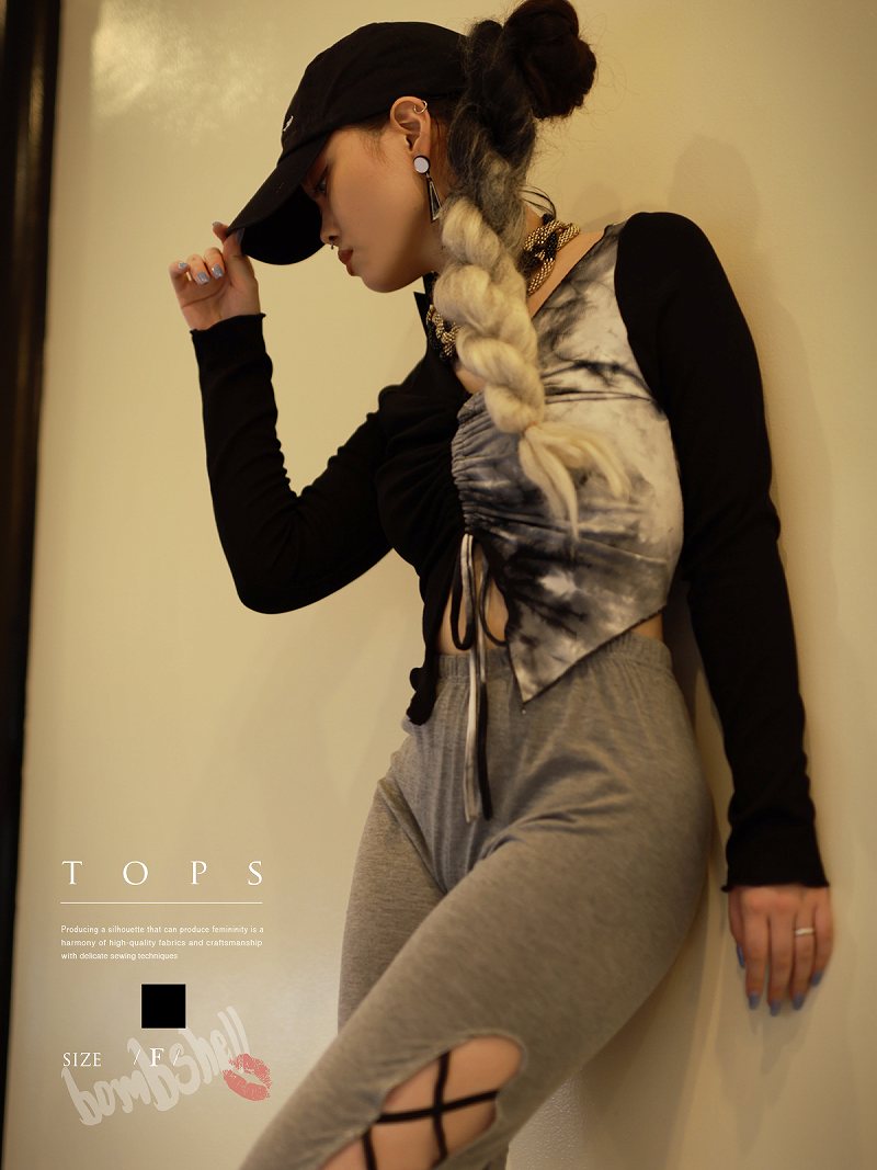【スーパーセール】半袖カットソー 長袖 タイダイ柄 カットソー バイカラー トップス 黒 へそ出し アシンメトリー ストリートファッション ダンス衣装 Bbomb あす楽
