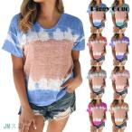 tシャツ レディース 半袖 切り替えカラー タイダイ クールネック 大きいサイズあり 欧米風 トップス ストライプ 着痩せ おしゃれ