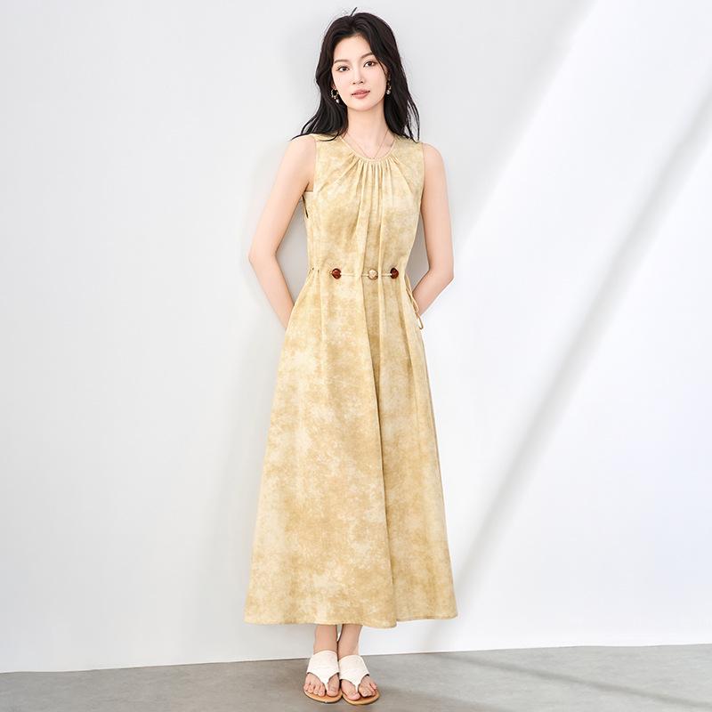 ワンピース レディース タイダイ柄 グラデーション プリント テンセル リヨセル 麻 ロング丈 ノースリーブ クルーネック ピンタック リラックス リゾートスタイル 夏 フレンチ 上品 グラデーションイエロー
