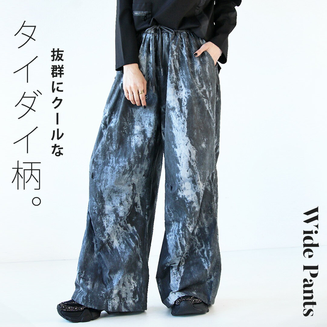 パンツワイド パンツ レディース ダークグレー 春 秋 冬 ロング ストレート ゆったり タイダイ柄 染柄 リラックス 綿 ビッグシルエット 体型カバー ゴムウエスト 股上深め 抜群にクールなタイダイ柄 ワイドパンツ 10/15