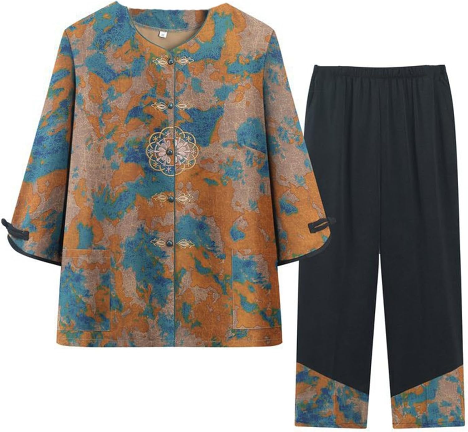 セットアップ Tシャツ 7分袖 ブラウス 9分 ワイドパンツ タイダイ染 高齢者 レディース 婦人服 中高年 老人 エスニック ゆったり サマー 綿 薄手 通気性 ホーム 通勤 お出かけ 60−80代