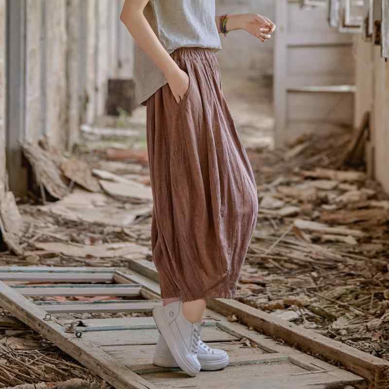 カジュアル パンツ レトロ プリーツ 風合い シルエット タイダイ柄 ワイドレッグ パンツ ハイウエスト スリム 快適 九分丈 ポケット ダメージ加工 リネン