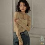 トップス レディース シアー 長袖 プルオーバー ハイネック ボトルネック チュール シースルー プリント タイダイ 柄 マーブル 2024秋冬