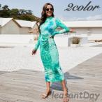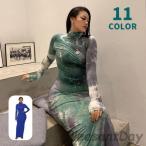 ワンピース タイト レディース 女性 長袖 ロング丈 ハイネック タイダイ柄 染め風 染め調 ボディライン お洒落 お出かけ 普段使い 婦人