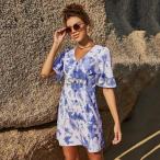ワンピース ミニワンピース レディース ミニ丈 膝上 半袖 フレアスリーブ Vネック Aライン タイダイ柄 シンプル カジュアル サーフ 上品 おしゃ