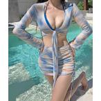 水着 「SETUP7」水着 ブルー タイダイ スプリット ビキニ カバーアップ 3点セット KNF142 レディース