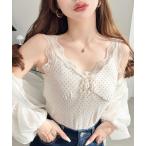 タンクトップ ノースリーブ ドットプリントテレコリブフロントシャーリングリボンレースタンクトップ レディース