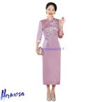 チャイナドレス 刺繍 ロング丈 パーティードレス 7分袖 エレガント ロングドレス 結婚式 二次会 ドレス ミモレ丈 司会ドレス 披露宴