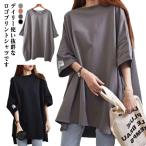 半袖ロングTシャツ レディース ティシャツ チュニック ロング丈 トップス カットソー 無地 5分袖 ビッグシルエット ドロップショルダー ゆったり
