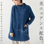 トップス チュニック ベロア リブ ニュアンス配色が映えるスモーキーベロアブルー 長袖 モックネック OTONA 40代 50代 60代