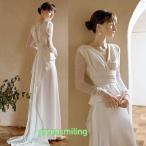 ウエディングドレス サテンドレス ホワイト 長袖 花嫁 結婚式 二次会 パーティードレス ブライダル ロング丈ドレス 披露宴 旅行 韓国挙式 ファッション 上品